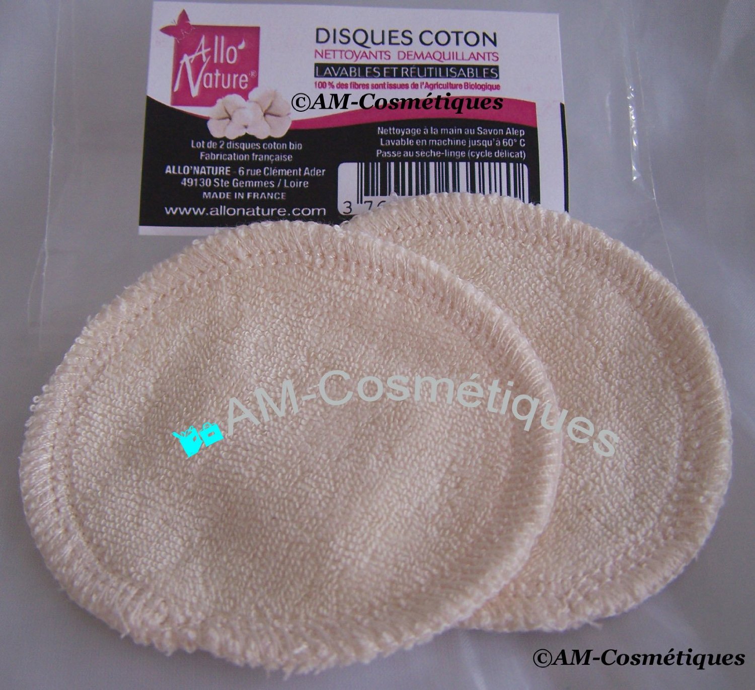 - Un sachet de de 2 Disques Coton (nettoyants démaquillants) – Lavages et Réutilisables 7/8cm environ – de la Marque Allo’Nature