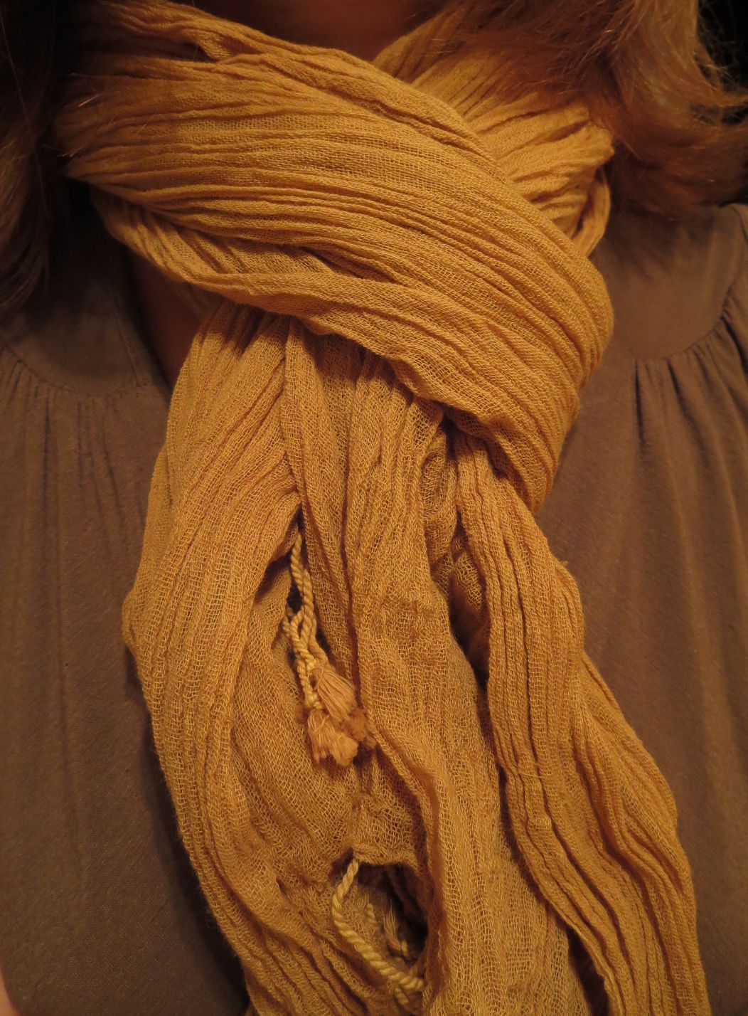Ce chèche va me servir d’écharpe mais comme en l’étirant il fait un peu plus d’un mètre, il pourra également me servir de châle mais encore mieux de paréo