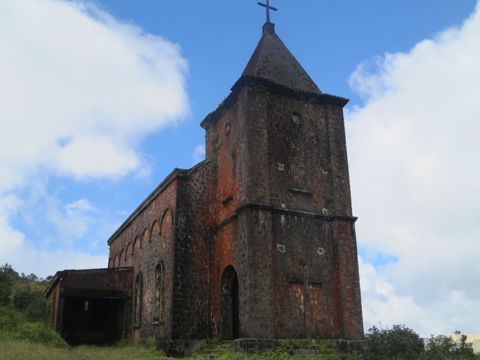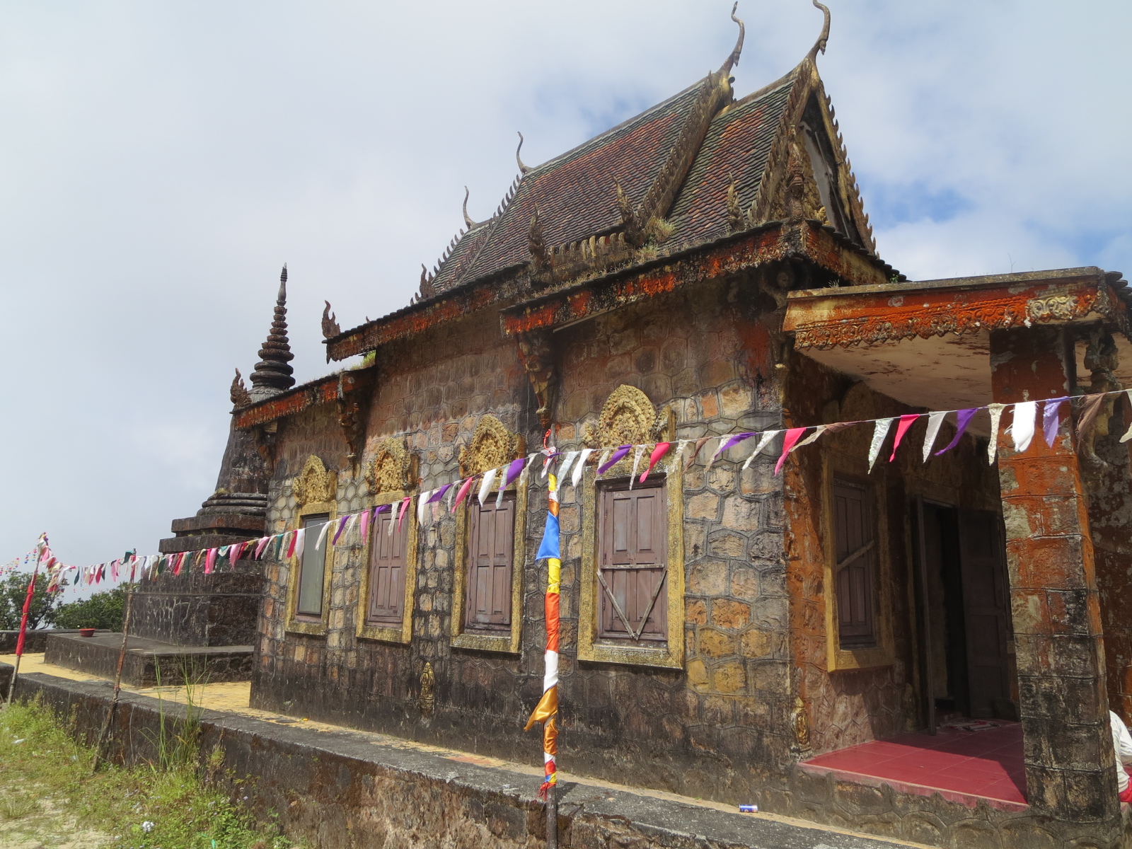 . Des morceaux de verre restent accrochés aux baies de la nef et une fenêtre latérale laisse encore apparaître les contours rouillés d’un crucifix. Les cloisons ont été ajoutées par les Khmers rouges. Un peu plus haut sur la colline, un à-pic surplombe la forêt vierge.