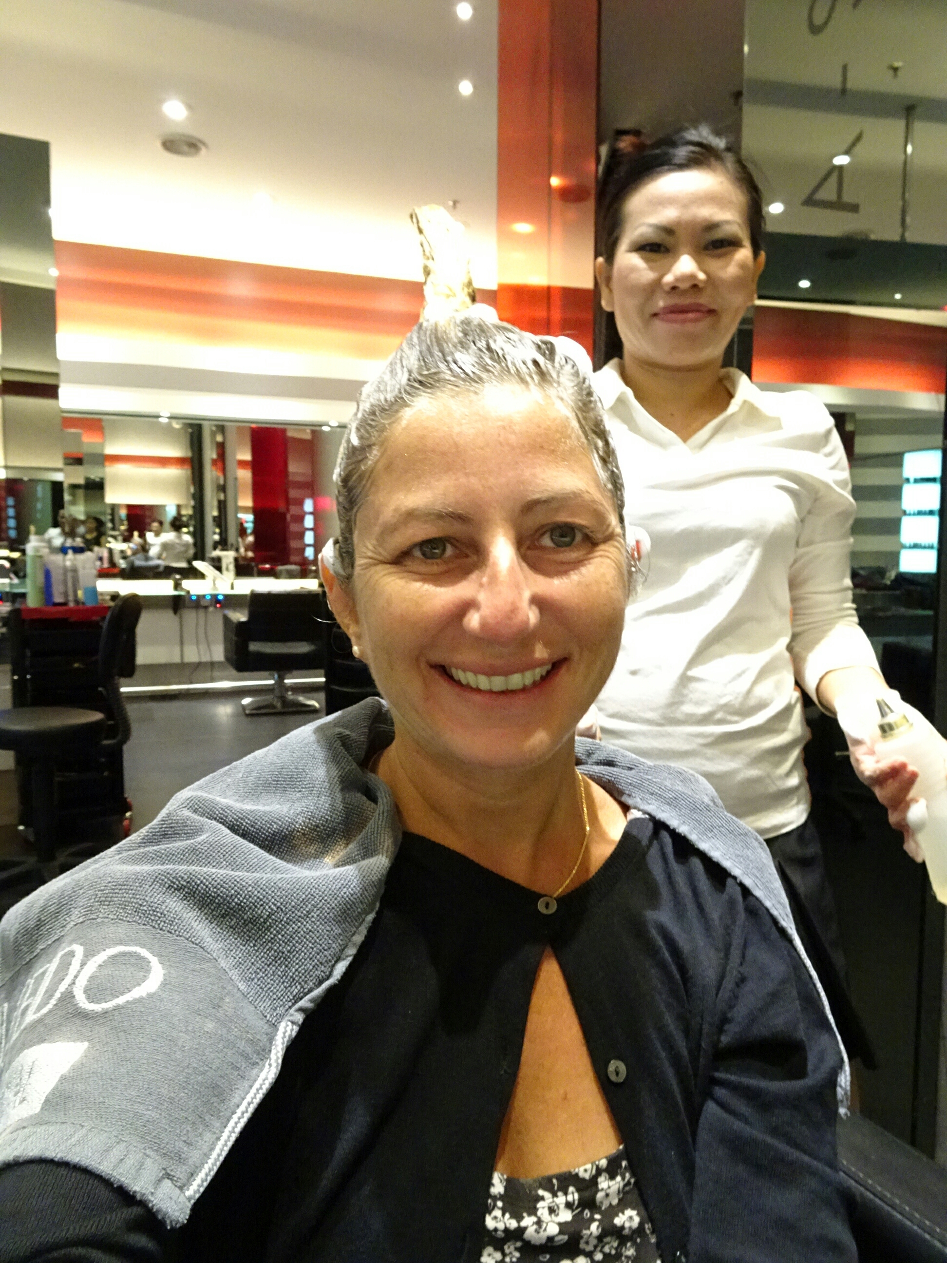 A short visit to a hairdresser. It’s funny here: you stay on your chair when they make the shampoo and then, they rinse you in the shampoo basin. It’s cool, because you are always lying at the hairdresser in Asia; no pain in the neck after.
