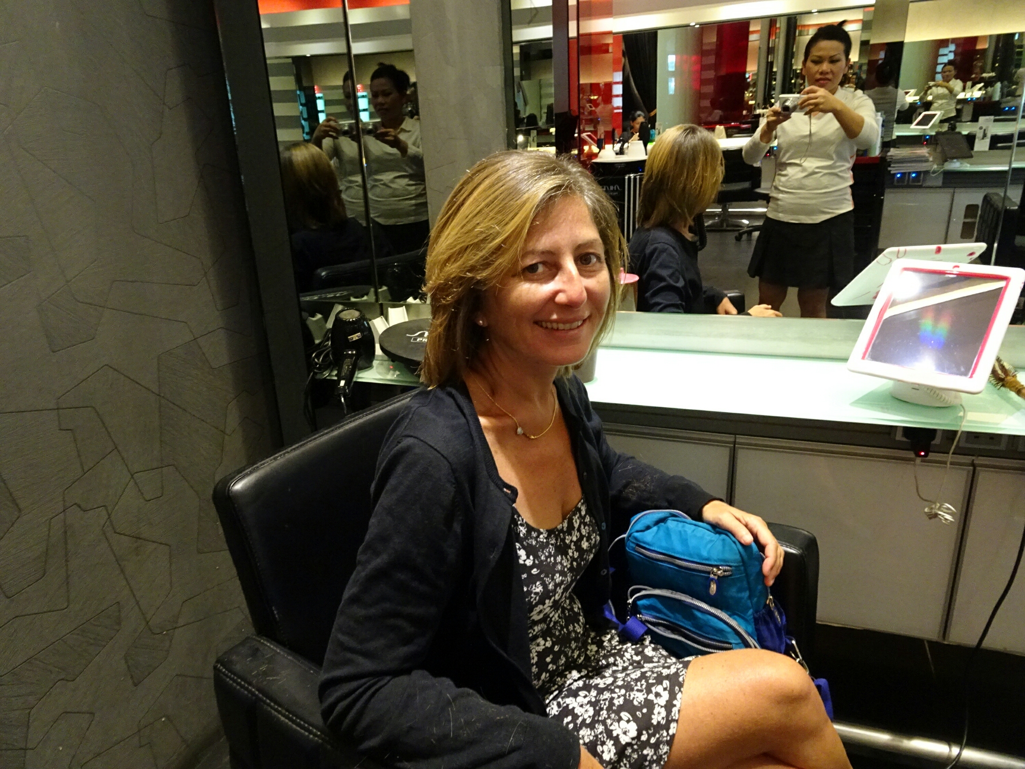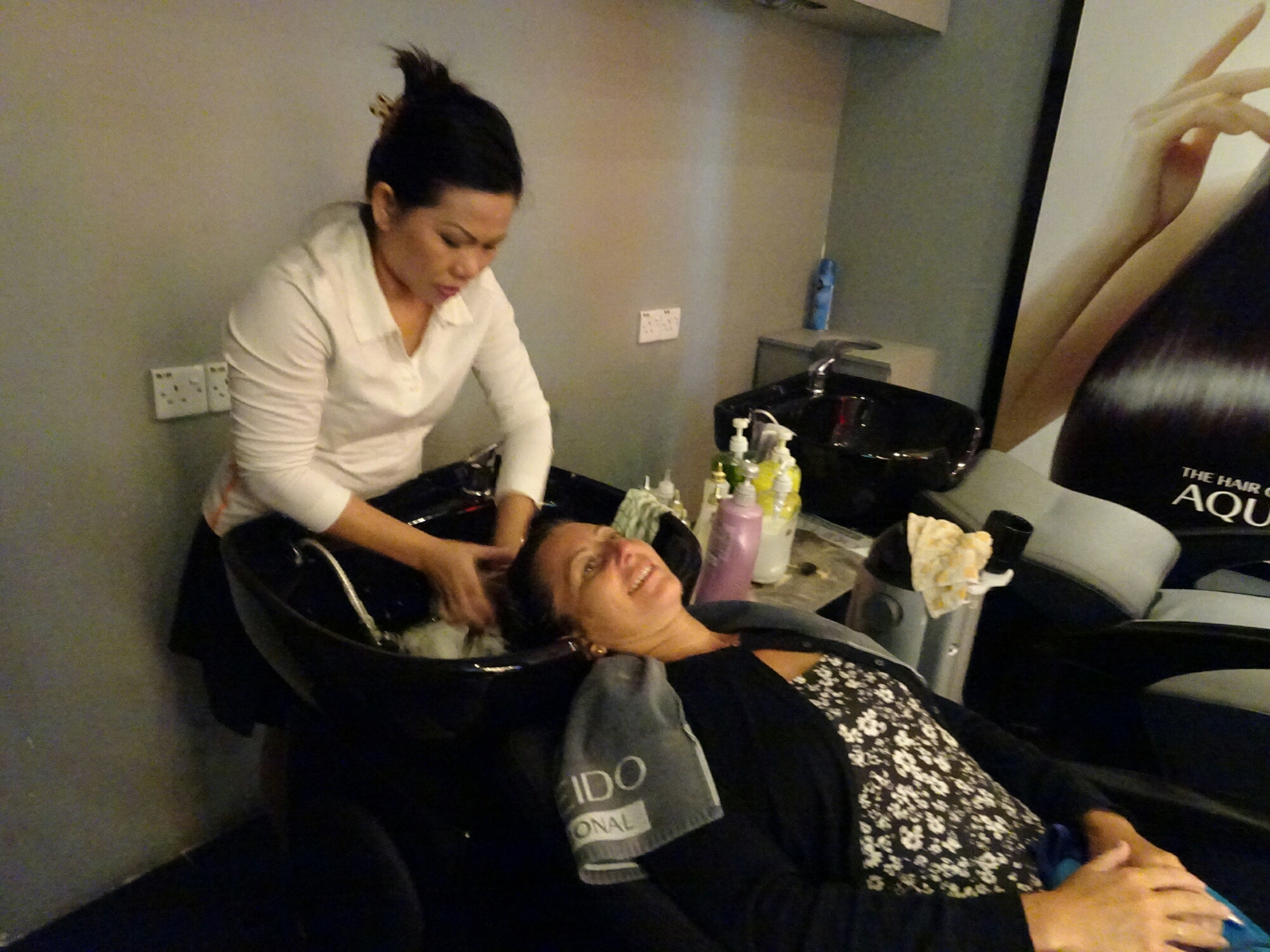 Un petit tour chez le coiffeur : alors ici c’est drôle, on vous lave les cheveux sur la chaise et on vous rince au bac. Ce qui est cool, c’est qu’on est toujours allongé chez le coiffeur en Asie, pas de mal de cou pendant des jours après une séance chez le coiffeur.