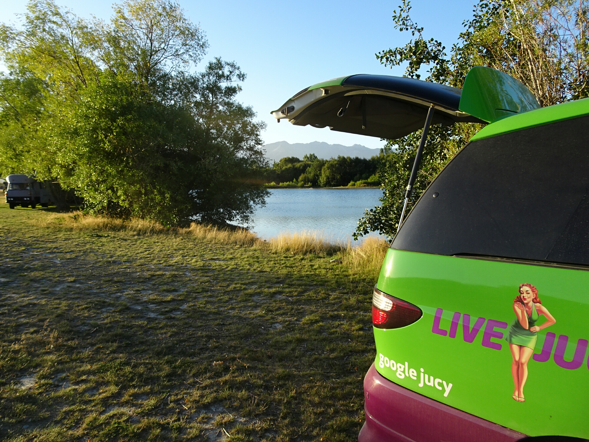 At night, we stop at a campsite at lake Ohau with a few ducks that come and keep us company.