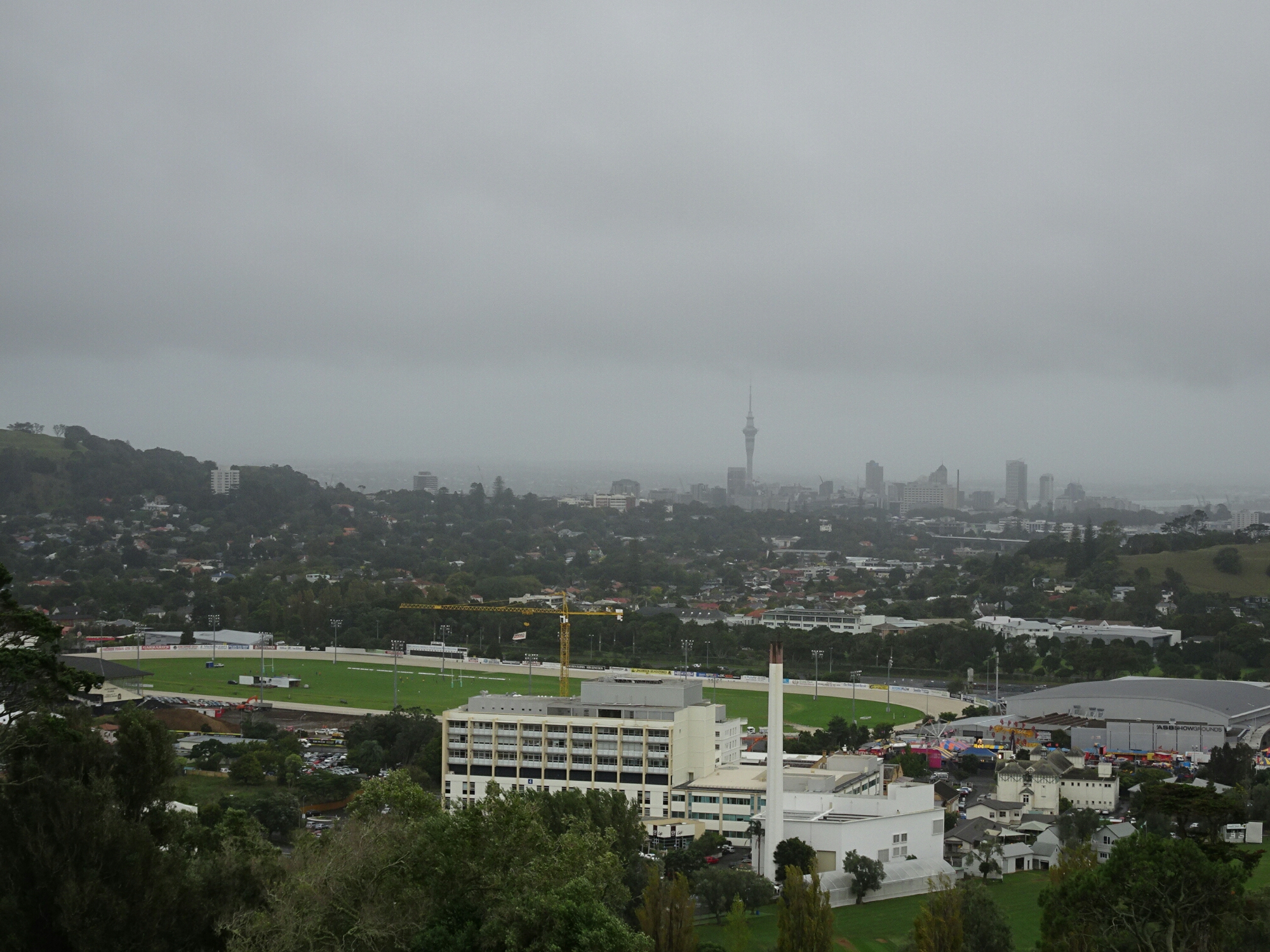 As we still had a day before returning the rental camper van, we drove up to the top of a volcano in Auckland, at « One Tree Hill » where we stopped to have a 360° view over the city. Unfortunately, As you can see on the photo, still no blue sky to enjoy the view.