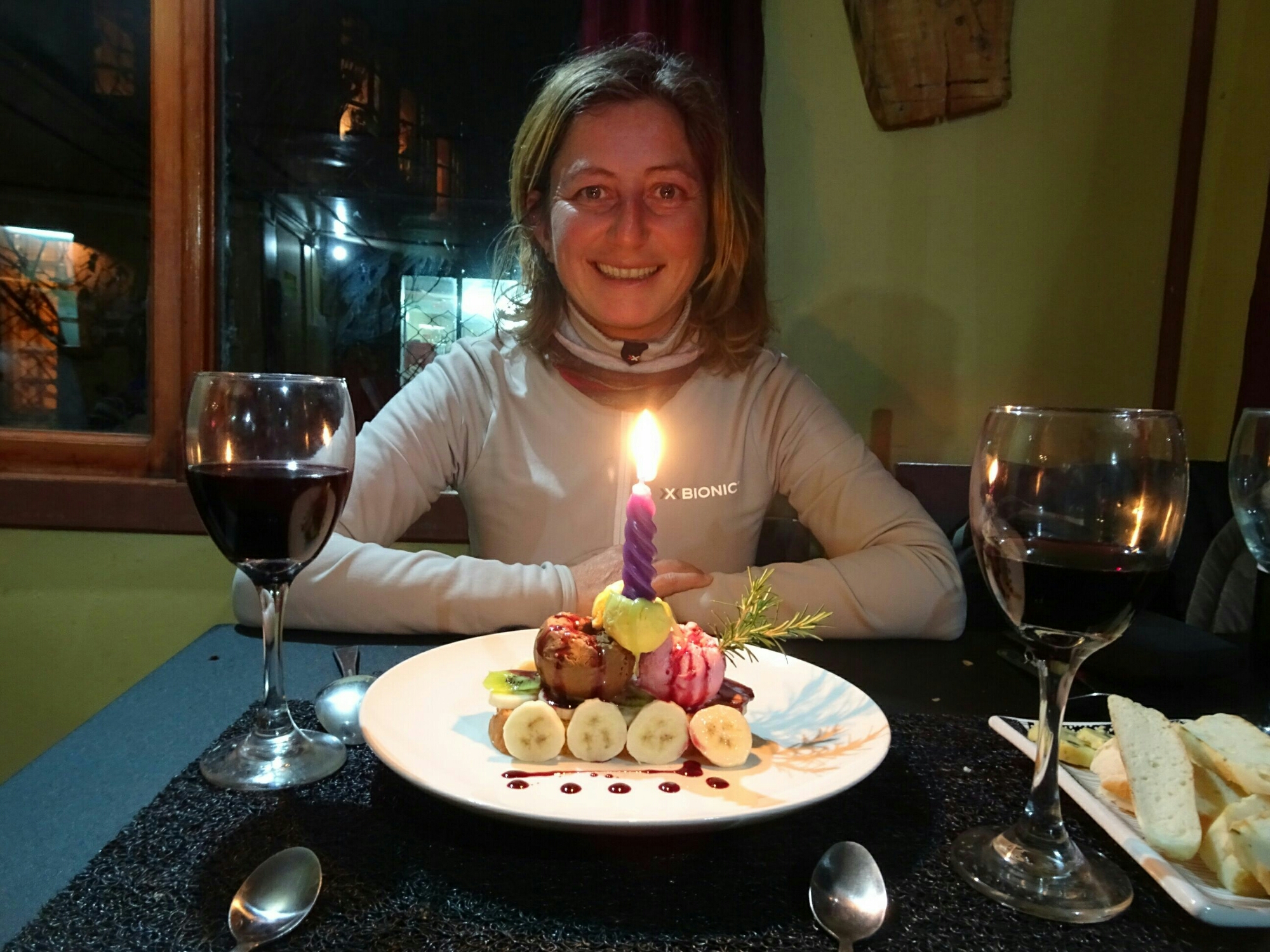 Premier soir ici, on se fait un resto pour mon anniversaire et je dois reconnaître que c’était l’un des meilleurs de Patagonie que j’ai fait où l’on m’a apporté un petit dessert improvisé pour l’occasion.
