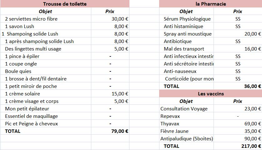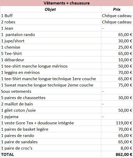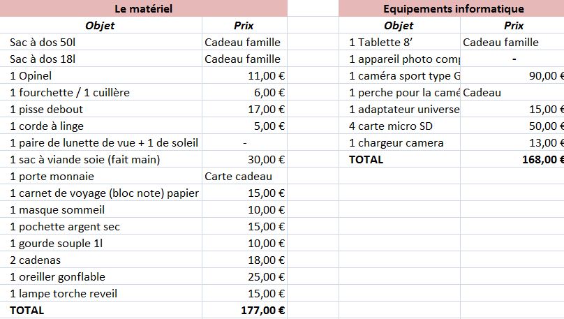 A un mois du départ, toutes mes achats sont afin réalisés et j’ai décidé de faire un bilan de toutes mes dépenses avant départ et voici ce que ça donne par thème.