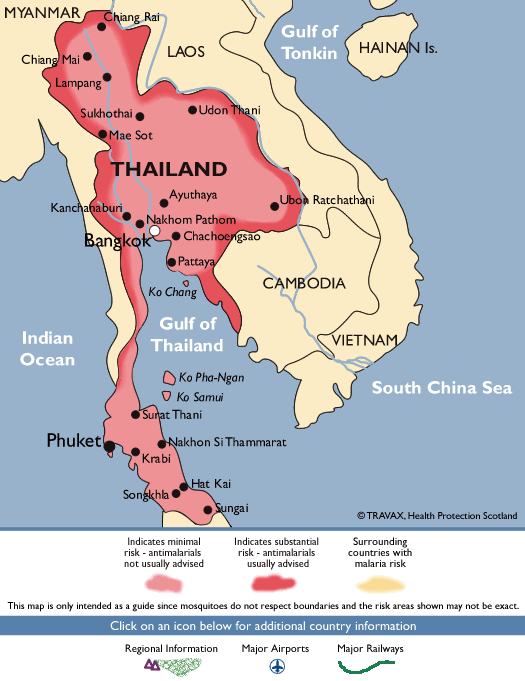 Transmission toute l’année dans tout le pays, sauf à Phnom-Penh et aux alentours du lac Tonle Sap. Absence de risque pour les touristes visitant Angkor Vat dans la journée.