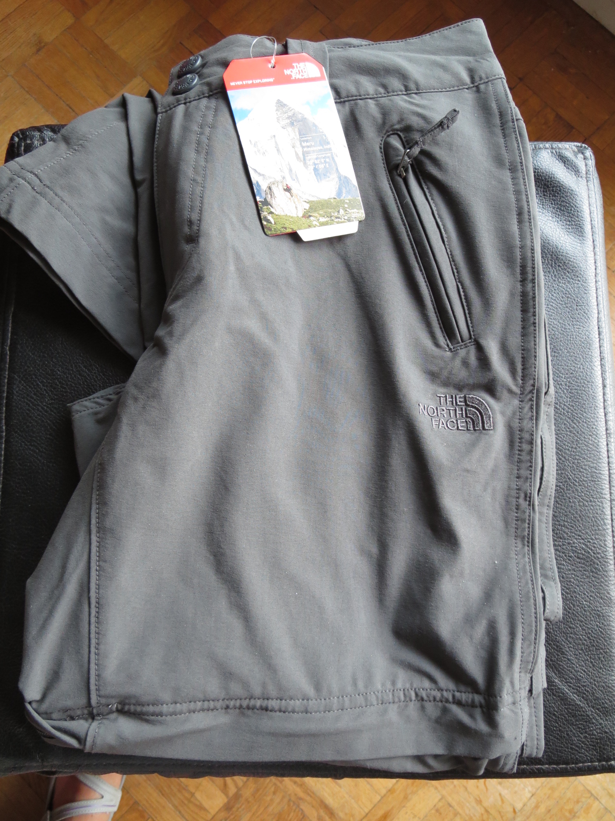 Donc il fallait que je trouve un modèle qui fasse short, qui n’est aucune « fioriture » dans le bas, de couleur grise/anthracite et dont le short ne soit pas trop court. Et croyez moi avec tous ces critères, ce n’est pas une mince affaire de trouver le bon modèle. Alors quand dans la boutique North Face j’essaie un modèle qui remplissait tous ces critères, je n’ai pas tergiversé très longtemps et voilà le premier achat de la journée effectué.